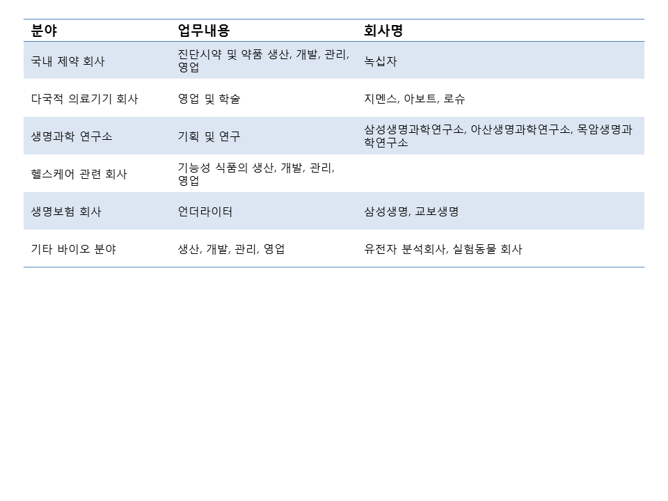 해외 제약회사 및 국내 제약회사 그리고 다국적 의료관련회사 및 헬스케어 관련 회사, 의료장비 및 시약판매회사, 의료보험회사 등에 취업하기에 유리하다.